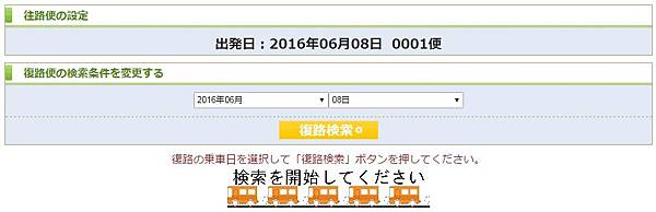 點「往復で予約」後,也會讓你選擇日期,然後點「復路検索(ふくろけんさく)」(查詢回程班次)